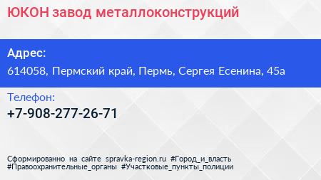 ЮКОН, завод металлоконструкций по адресу 614058, Пермский край, Пермь, Сергея Есенина, 45а в дальнейшем Организация, размещена в следующих категориях: