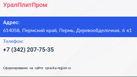 УралПлитПром по адресу 614058, Пермский край, Пермь, Деревообделочная, 6 к1 в дальнейшем Организация, размещена в следующих категориях: