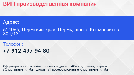 ВИН, производственная компания по адресу 614065, Пермский край, Пермь, шоссе Космонавтов, 304/13 в дальнейшем Организация, размещена в следующих категориях: