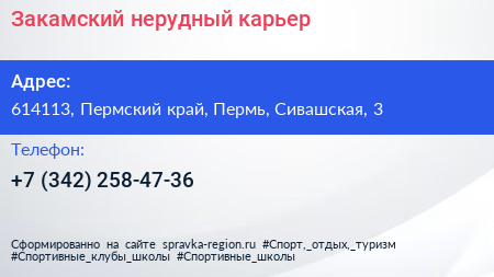 Закамский нерудный карьер по адресу 614113, Пермский край, Пермь, Сивашская, 3 в дальнейшем Организация, размещена в следующих категориях: