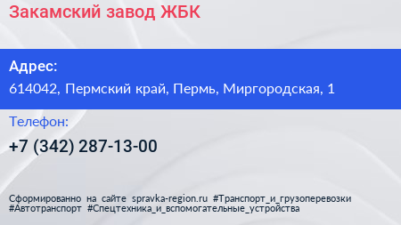 Закамский завод ЖБК по адресу 614042, Пермский край, Пермь, Миргородская, 1 в дальнейшем Организация, размещена в следующих категориях: