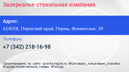 Зазеркалье, стекольная компания по адресу 614058, Пермский край, Пермь, Фоминская, 39 в дальнейшем Организация, размещена в следующих категориях: