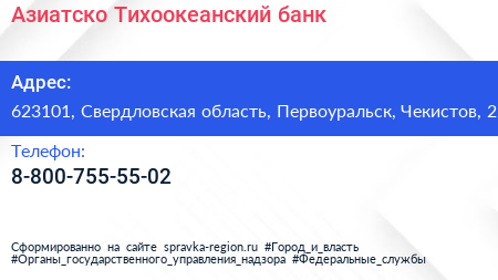 Азиатско-Тихоокеанский банк по адресу 623101, Свердловская область, Первоуральск, Чекистов, 2 в дальнейшем Организация, размещена в следующих категориях: