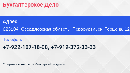Бухгалтерское Дело по адресу 623104, Свердловская область, Первоуральск, Герцена, 12 в дальнейшем Организация, размещена в следующих категориях: