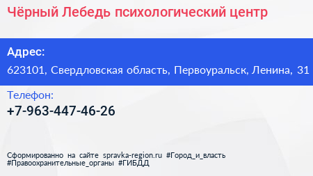 Чёрный Лебедь, психологический центр по адресу 623101, Свердловская область, Первоуральск, Ленина, 31 в дальнейшем Организация, размещена в следующих категориях: