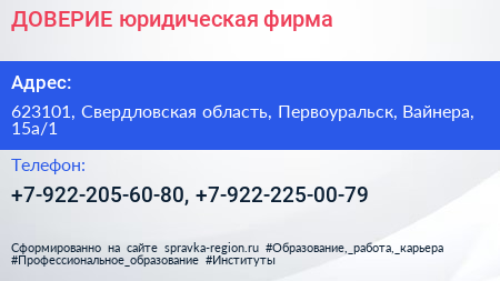 ДОВЕРИЕ, юридическая фирма по адресу 623101, Свердловская область, Первоуральск, Вайнера, 15а/1 в дальнейшем Организация, размещена в следующих категориях: