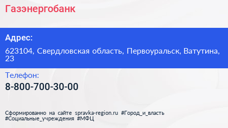 Газэнергобанк по адресу 623104, Свердловская область, Первоуральск, Ватутина, 23 в дальнейшем Организация, размещена в следующих категориях: