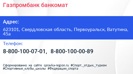 Газпромбанк, банкомат по адресу 623101, Свердловская область, Первоуральск, Ватутина, 45а в дальнейшем Организация, размещена в следующих категориях: