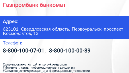Газпромбанк, банкомат по адресу 623101, Свердловская область, Первоуральск, проспект Космонавтов, 13 в дальнейшем Организация, размещена в следующих категориях: