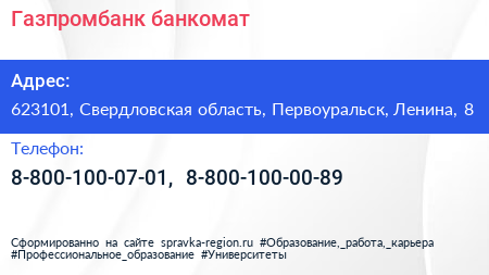 Газпромбанк, банкомат по адресу 623101, Свердловская область, Первоуральск, Ленина, 8 в дальнейшем Организация, размещена в следующих категориях: