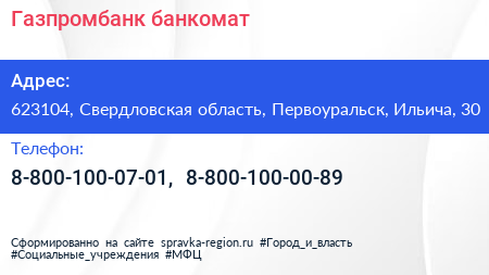 Газпромбанк, банкомат по адресу 623104, Свердловская область, Первоуральск, Ильича, 30 в дальнейшем Организация, размещена в следующих категориях: