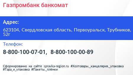 Газпромбанк, банкомат по адресу 623104, Свердловская область, Первоуральск, Трубников, 52г в дальнейшем Организация, размещена в следующих категориях: