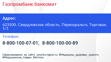 Газпромбанк, банкомат по адресу 623100, Свердловская область, Первоуральск, Торговая, 1/1 в дальнейшем Организация, размещена в следующих категориях: