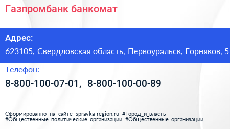 Газпромбанк, банкомат по адресу 623105, Свердловская область, Первоуральск, Горняков, 5 в дальнейшем Организация, размещена в следующих категориях: