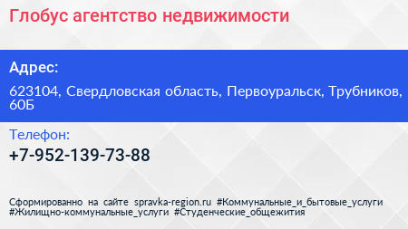 Глобус, агентство недвижимости по адресу 623104, Свердловская область, Первоуральск, Трубников, 60Б в дальнейшем Организация, размещена в следующих категориях: