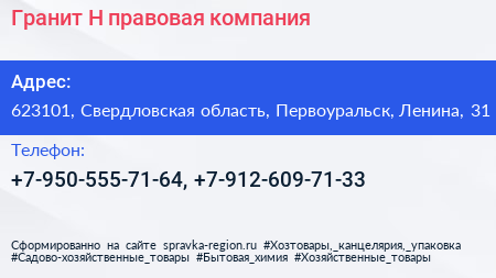 Гранит Н, правовая компания по адресу 623101, Свердловская область, Первоуральск, Ленина, 31 в дальнейшем Организация, размещена в следующих категориях: