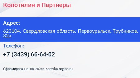 Колотилин и Партнеры по адресу 623104, Свердловская область, Первоуральск, Трубников, 32а в дальнейшем Организация, размещена в следующих категориях: