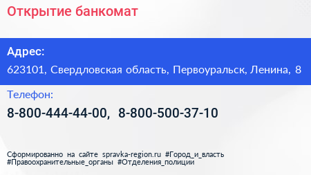 Открытие, банкомат по адресу 623101, Свердловская область, Первоуральск, Ленина, 8 в дальнейшем Организация, размещена в следующих категориях: