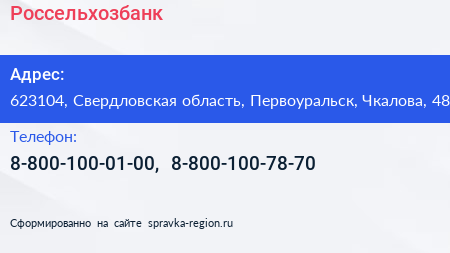Россельхозбанк по адресу 623104, Свердловская область, Первоуральск, Чкалова, 48 в дальнейшем Организация, размещена в следующих категориях: