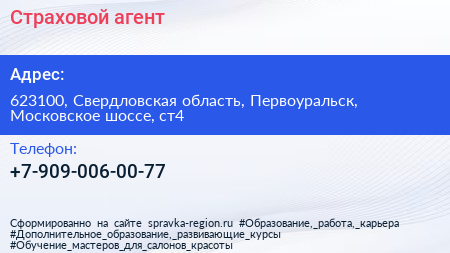 Страховой агент по адресу 623100, Свердловская область, Первоуральск, Московское шоссе, ст4 в дальнейшем Организация, размещена в следующих категориях: