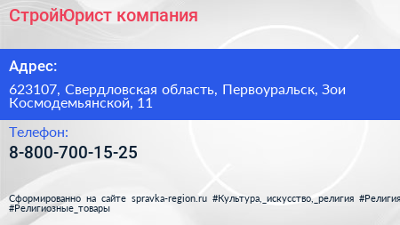 СтройЮрист, компания по адресу 623107, Свердловская область, Первоуральск, Зои Космодемьянской, 11 в дальнейшем Организация, размещена в следующих категориях: