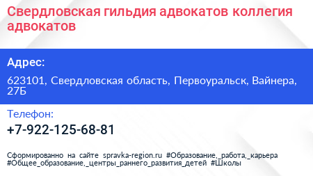 Свердловская гильдия адвокатов, коллегия адвокатов по адресу 623101, Свердловская область, Первоуральск, Вайнера, 27Б в дальнейшем Организация, размещена в следующих категориях: