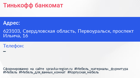 Тинькофф, банкомат по адресу 623103, Свердловская область, Первоуральск, проспект Ильича, 16 в дальнейшем Организация, размещена в следующих категориях: