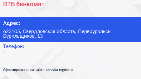 ВТБ, банкомат по адресу 623105, Свердловская область, Первоуральск, Бурильщиков, 13 в дальнейшем Организация, размещена в следующих категориях: