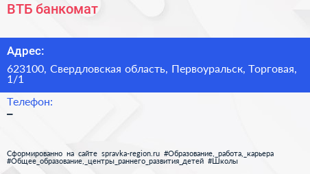 ВТБ, банкомат по адресу 623100, Свердловская область, Первоуральск, Торговая, 1/1 в дальнейшем Организация, размещена в следующих категориях: