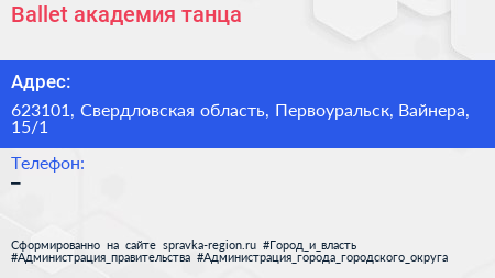 Ballet, академия танца по адресу 623101, Свердловская область, Первоуральск, Вайнера, 15/1 в дальнейшем Организация, размещена в следующих категориях: