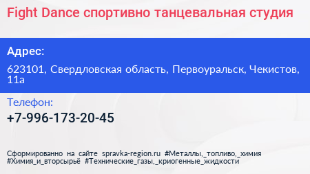 Fight & Dance, спортивно-танцевальная студия по адресу 623101, Свердловская область, Первоуральск, Чекистов, 11а в дальнейшем Организация, размещена в следующих категориях:
