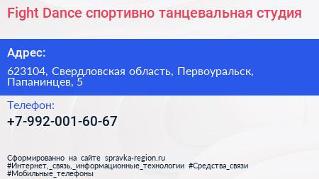 Fight & Dance, спортивно-танцевальная студия по адресу 623104, Свердловская область, Первоуральск, Папанинцев, 5 в дальнейшем Организация, размещена в следующих категориях: