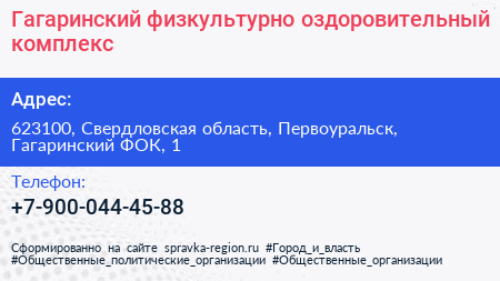 Гагаринский, физкультурно-оздоровительный комплекс по адресу 623100, Свердловская область, Первоуральск, Гагаринский ФОК, 1 в дальнейшем Организация, размещена в следующих категориях: