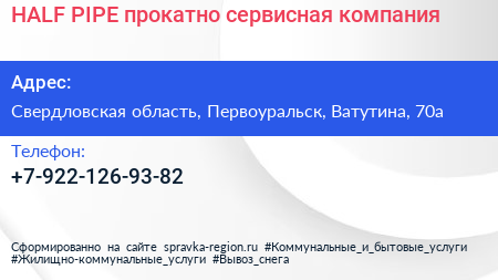 HALF-PIPE, прокатно-сервисная компания по адресу Свердловская область, Первоуральск, Ватутина, 70а в дальнейшем Организация, размещена в следующих категориях: