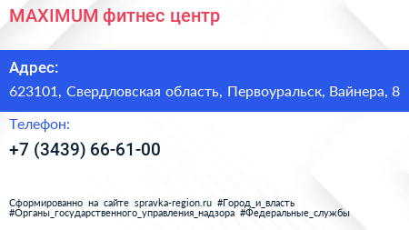 MAXIMUM, фитнес-центр по адресу 623101, Свердловская область, Первоуральск, Вайнера, 8 в дальнейшем Организация, размещена в следующих категориях:
