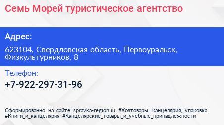 Семь Морей, туристическое агентство по адресу 623104, Свердловская область, Первоуральск, Физкультурников, 8 в дальнейшем Организация, размещена в следующих категориях: