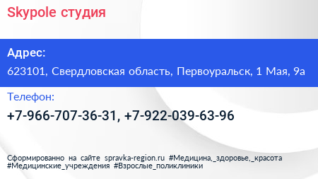 Skypole, студия по адресу 623101, Свердловская область, Первоуральск, 1 Мая, 9а в дальнейшем Организация, размещена в следующих категориях: