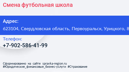 Смена, футбольная школа по адресу 623104, Свердловская область, Первоуральск, Урицкого, 8 в дальнейшем Организация, размещена в следующих категориях: