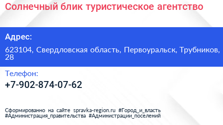 Солнечный блик, туристическое агентство по адресу 623104, Свердловская область, Первоуральск, Трубников, 28 в дальнейшем Организация, размещена в следующих категориях: