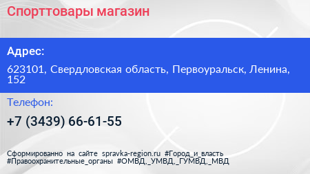 Спорттовары, магазин по адресу 623101, Свердловская область, Первоуральск, Ленина, 152 в дальнейшем Организация, размещена в следующих категориях: