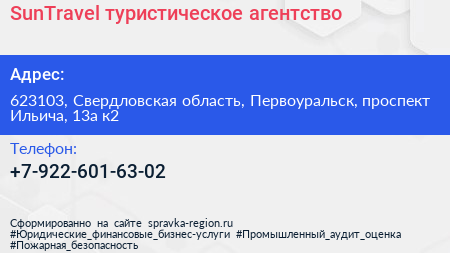 SunTravel, туристическое агентство по адресу 623103, Свердловская область, Первоуральск, проспект Ильича, 13а к2 в дальнейшем Организация, размещена в следующих категориях:
