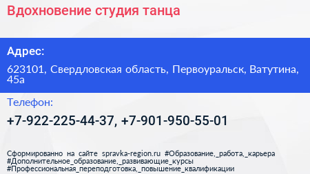 Вдохновение, студия танца по адресу 623101, Свердловская область, Первоуральск, Ватутина, 45а в дальнейшем Организация, размещена в следующих категориях: