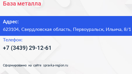 База металла по адресу 623104, Свердловская область, Первоуральск, Ильича, 8/1 в дальнейшем Организация, размещена в следующих категориях: