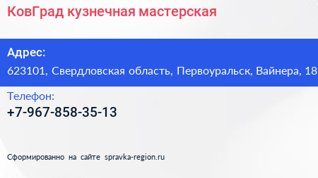 КовГрад, кузнечная мастерская по адресу 623101, Свердловская область, Первоуральск, Вайнера, 18 в дальнейшем Организация, размещена в следующих категориях:
