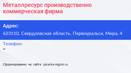 Металлресурс, производственно-коммерческая фирма по адресу 623110, Свердловская область, Первоуральск, Мира, 4 в дальнейшем Организация, размещена в следующих категориях: