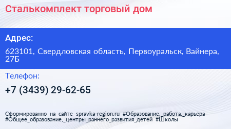 Сталькомплект, торговый дом по адресу 623101, Свердловская область, Первоуральск, Вайнера, 27Б в дальнейшем Организация, размещена в следующих категориях: