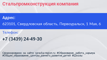 Стальпромконструкция, компания по адресу 623101, Свердловская область, Первоуральск, 1 Мая, 6 в дальнейшем Организация, размещена в следующих категориях: