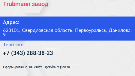 Trubmann, завод по адресу 623101, Свердловская область, Первоуральск, Данилова, 9 в дальнейшем Организация, размещена в следующих категориях: