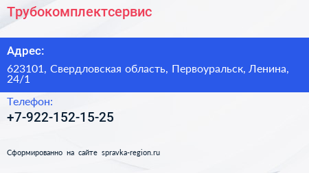 Трубокомплектсервис по адресу 623101, Свердловская область, Первоуральск, Ленина, 24/1 в дальнейшем Организация, размещена в следующих категориях: