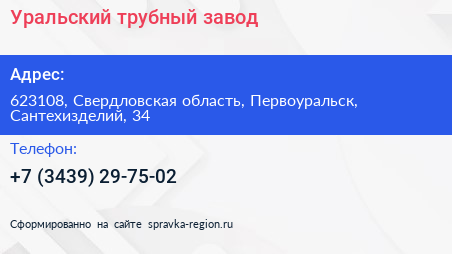 Уральский трубный завод по адресу 623108, Свердловская область, Первоуральск, Сантехизделий, 34 в дальнейшем Организация, размещена в следующих категориях: